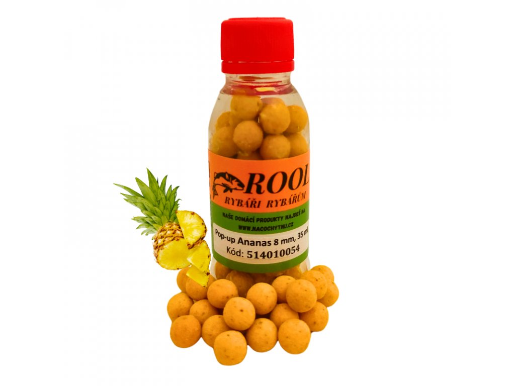 Netradiční nástraha pro lov kaprů a amurů - ananasové plovoucí pop-up boilies, průměr 8 mm. Vyrábějí se v Podkrkonoší v malovýrobě a jsou originální a kvalitní. Boilies jsou zbarveny do žluté barvy, velmi výrazné proti tmavému dnu a představují ideální nástrahu na method feeder.