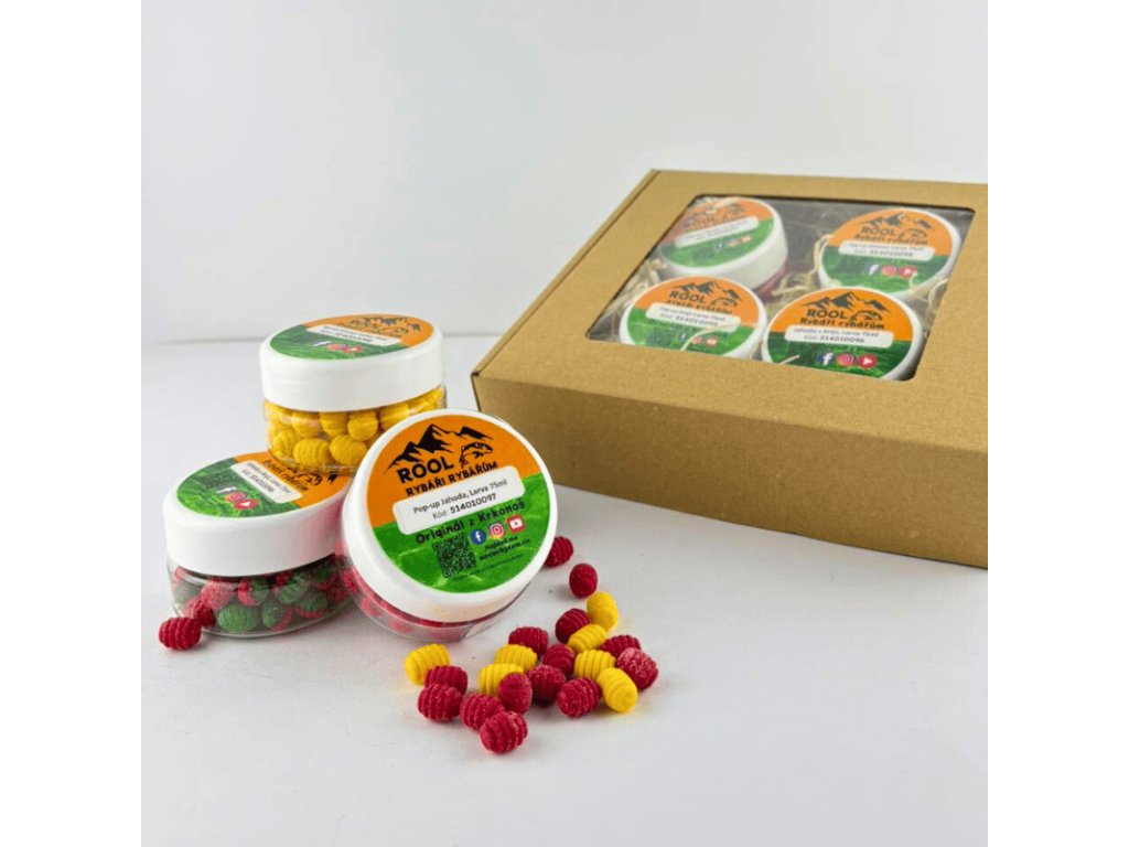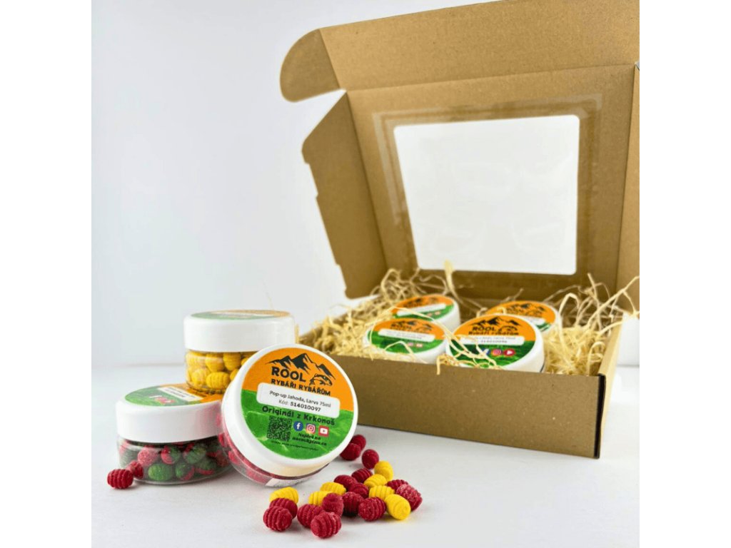Dárková krabička pro rybáře obsahuje ručně vyráběné kvalitní plovoucí boilies, tzv Pop-Up na lov ryb, převážně kaprů a amurů. Popup jsou vytvarované do larev, které připomínají drobné živočichy a jsou pro ryby o to více atraktivní.