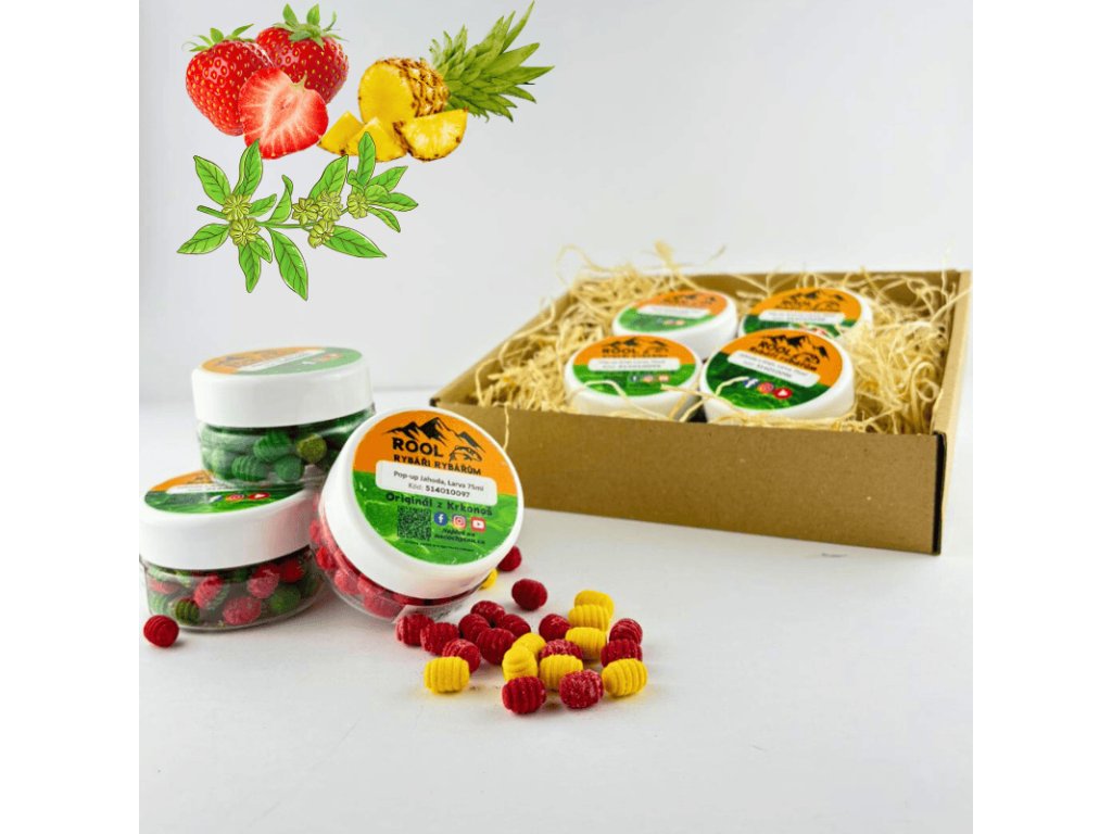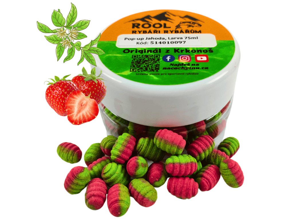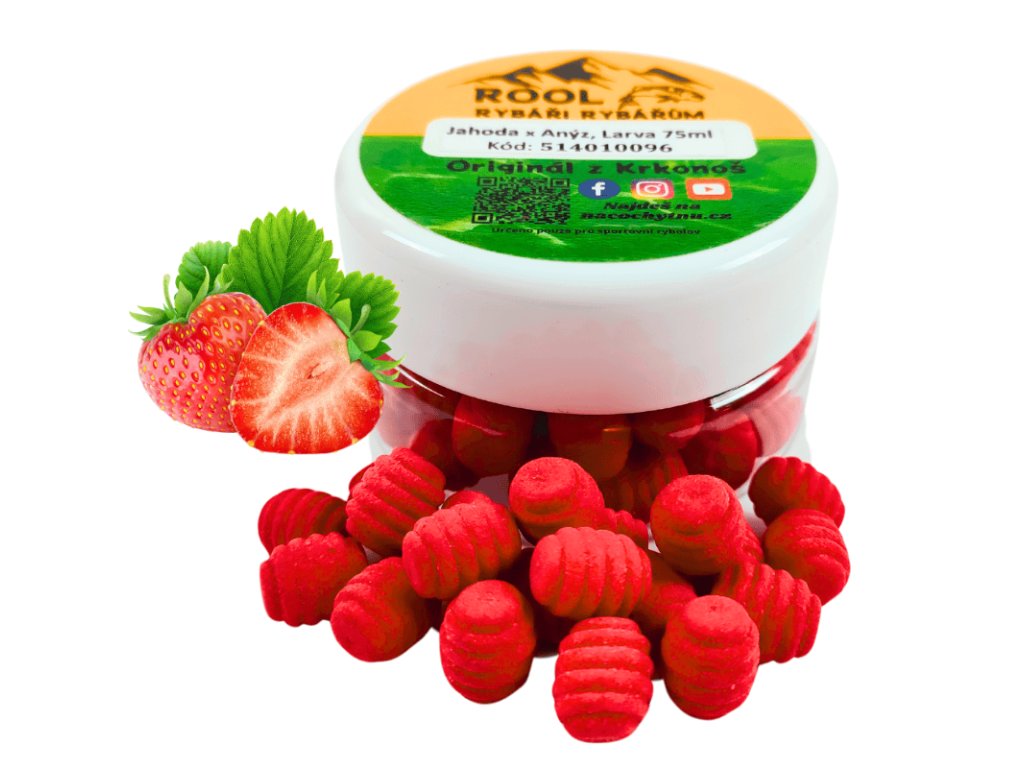 Plovoucí kombinované larvy jahoda a anýz- Spojení dvou velmi oblíbených variant, jahodové a anýzové těsto v jednom produktu. Sladká a kořeněná příchuť je pro ryby zajímavá, obzvláště ve tvaru larvy, která připomíná přirozenou potravu.