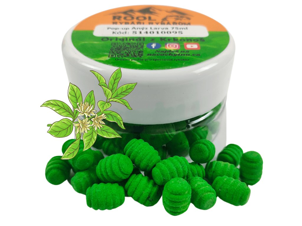 Plovoucí larvy anýzové - Velmi oblíbená příchuť, anýzová varianta vyniká kořeněnou příchutí a těsto obsahuje pravý jemně mletý anýz. Svoji barvou napodobuje barvu přirozené potravy ryb u břehů atd.